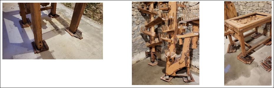 In December the frost at -7°C in Péjuscla caused an outside water pipe to burst like a geyser ! Fortunately, our neighbours intervened to switch off the water at the meter. But too late, the water had already infiltrated the wall closest to the Museum. It was Sue, surrounded by a three-man team, who went to the rescue of the singular machines by putting some of them on chocks.