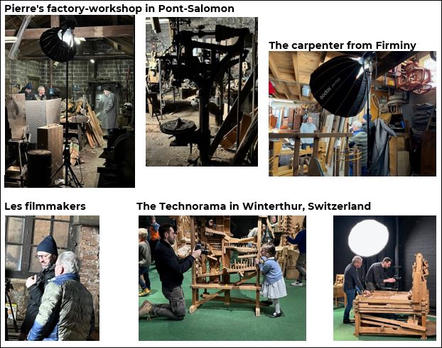 A film on ‘the work of Pierre Andrès’ is currently in the making. Shots were taken at the end of February/beginning of March in Pierre’s former factory-workshop in Pont-Salomon, at the home of a carpenter from Firminy who has replicated or repaired a number of singular machines, in the Technorama in Winterthur, Switzerland (a museum that has 18 machines and can be considered the equivalent of La Villette).