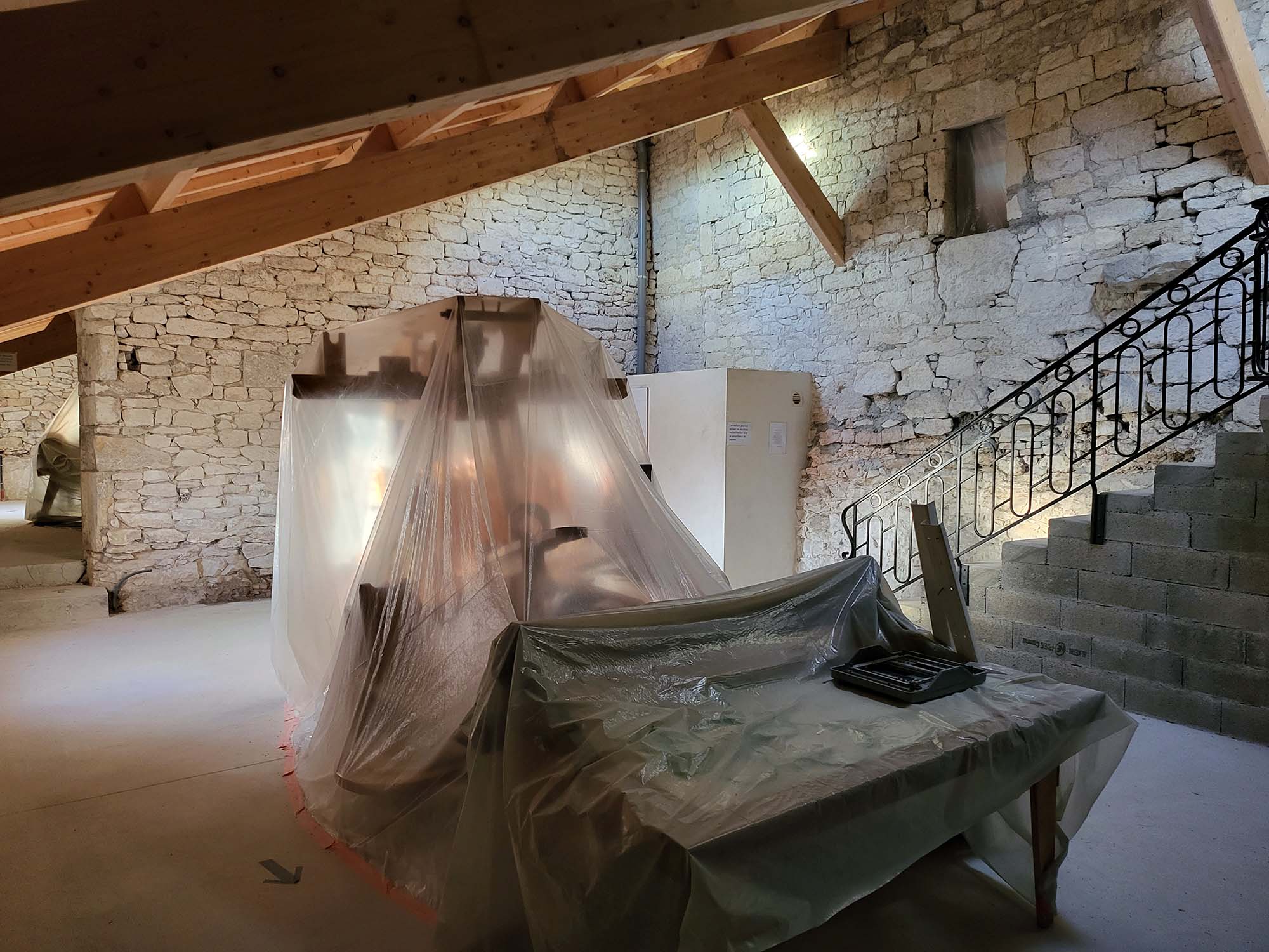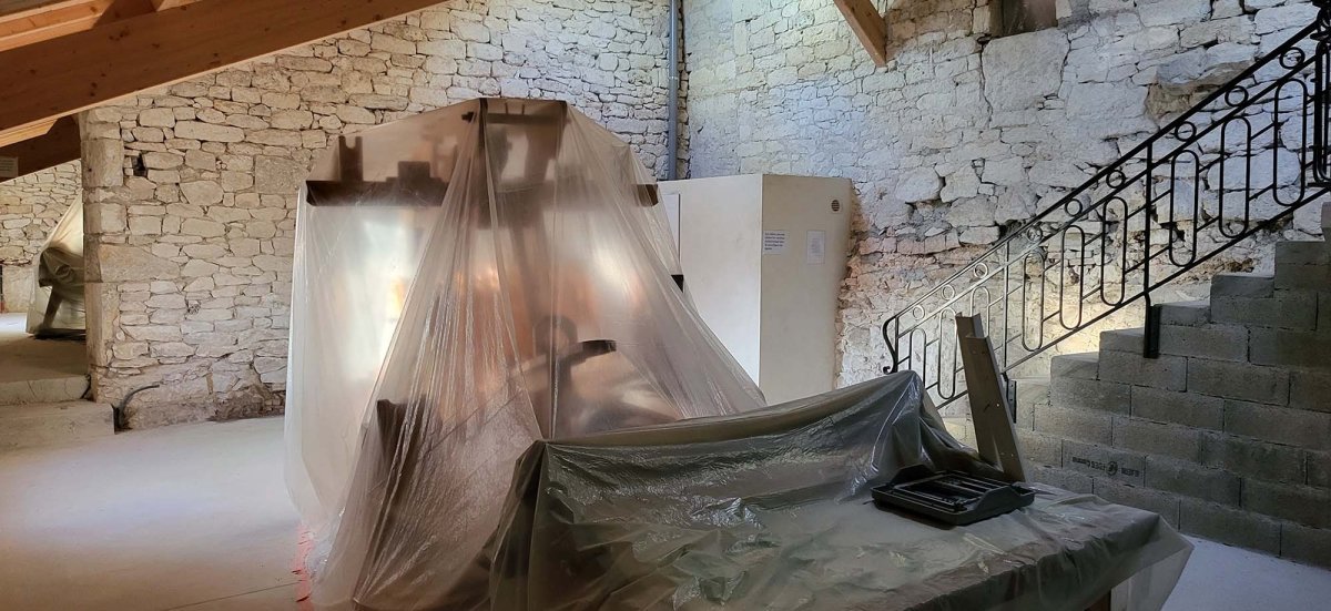 > Réfection de tous les murs intérieurs sur la partie basse du musée avec jointoiement des pierres et crépis sur les parpaings de l’escalier.